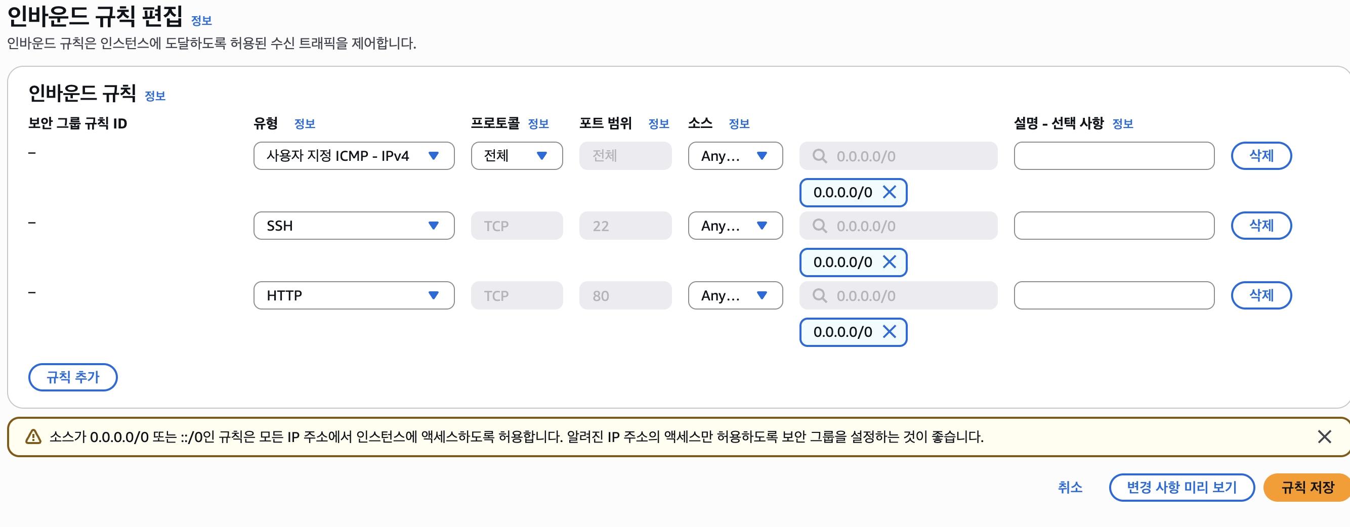 - 보안 그룹 설정 ( 보안 규칙 설정 후 EC2에 연결 적용 )