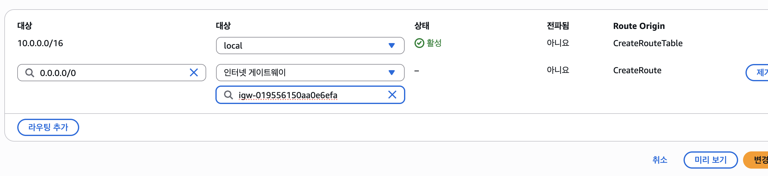 - public용 routing table로 생성 (VPC) 라우팅 편집 : Internet Gateway추가