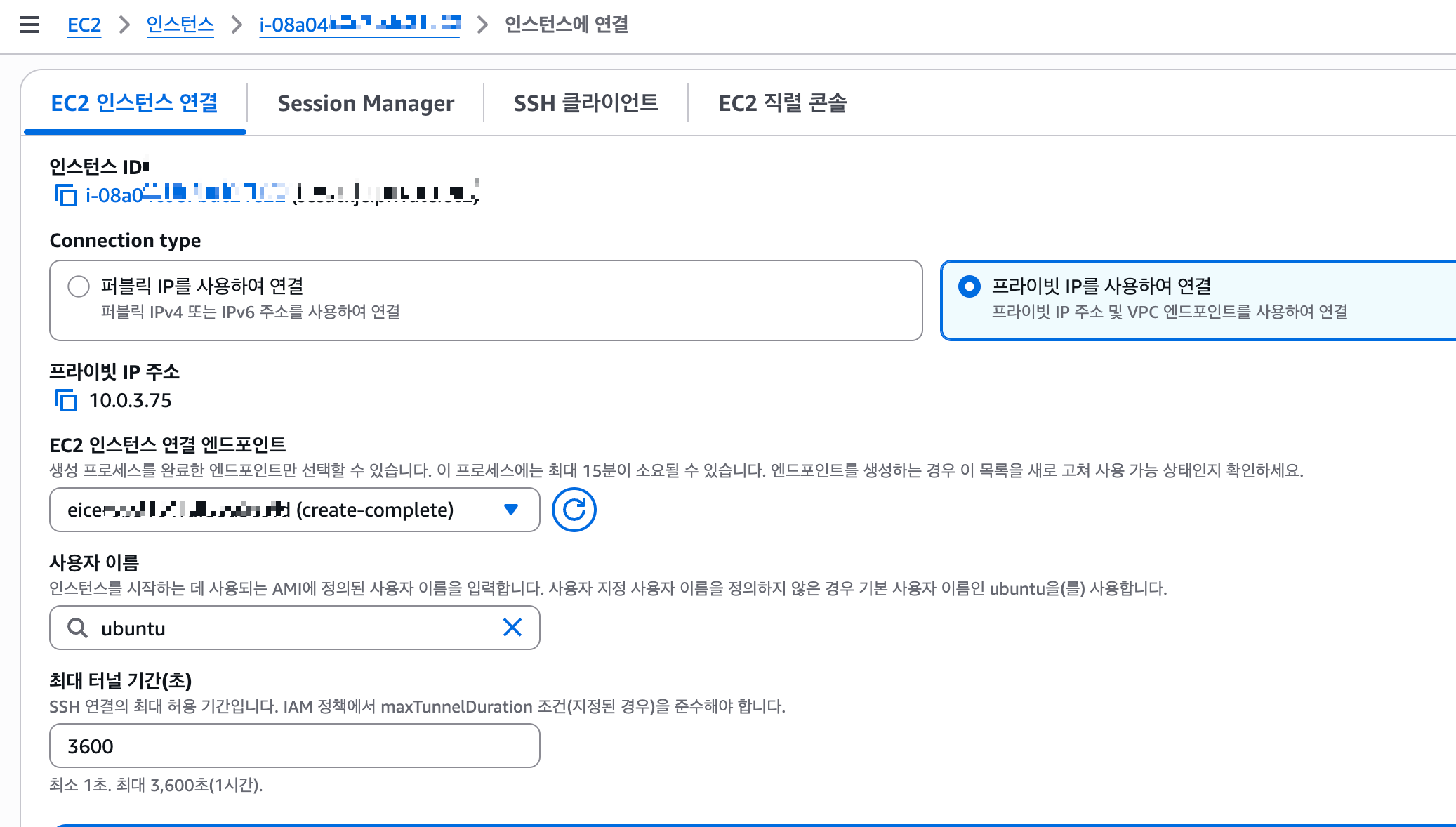 - Private security group의 inbound 보안 규칙에 EICE 보안그룹 설정