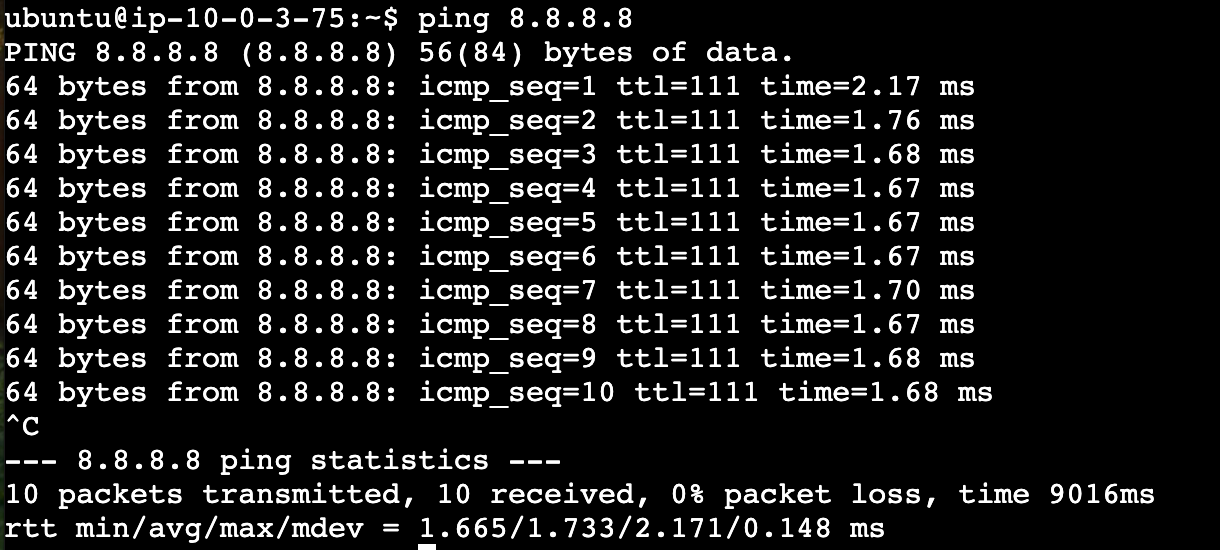 ubuntu@ip-10-0-1-26:~$ ping 10.0.3.75