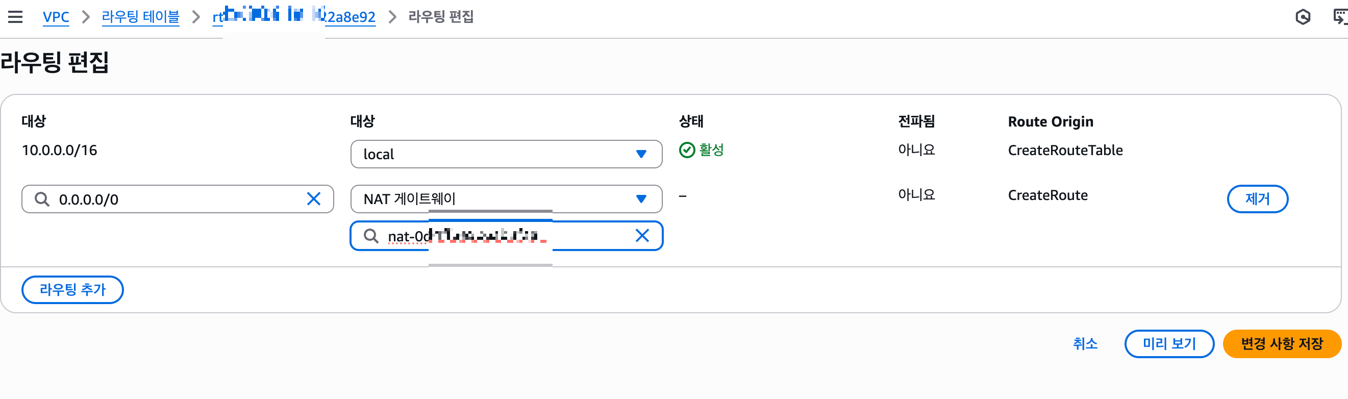 ( 인스턴스가 배치된 private.subnet이 연결된 routing 테이블에 NAT에 연결 )