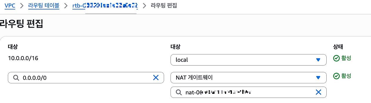 - Private Subnet의 Routing Table 편집 ( NAT 추가하여 외부 접속 설정 )