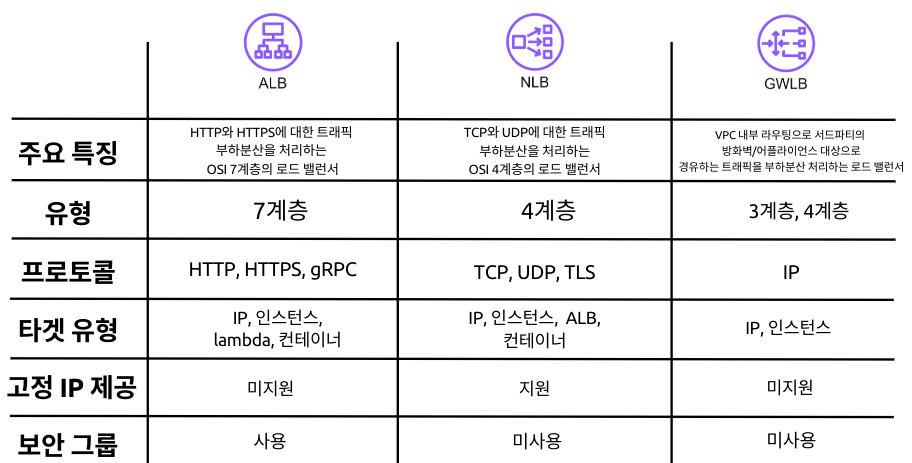 - ALB(Application LB), NLB(Network LB, 속도가 빠른편 ), GWLB( 방화벽,어플라이언스등 대상)