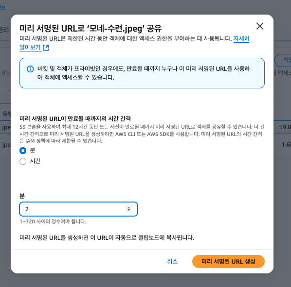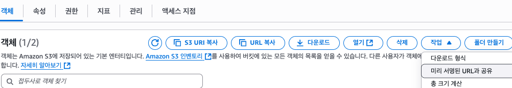 ** 비 공개시 pre-signed-url로 공유가능