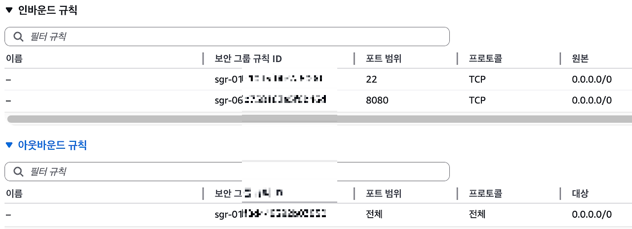 - Inbound Traffic : 22번(SSH), 8080(TCP, Backend-server접근) 허용