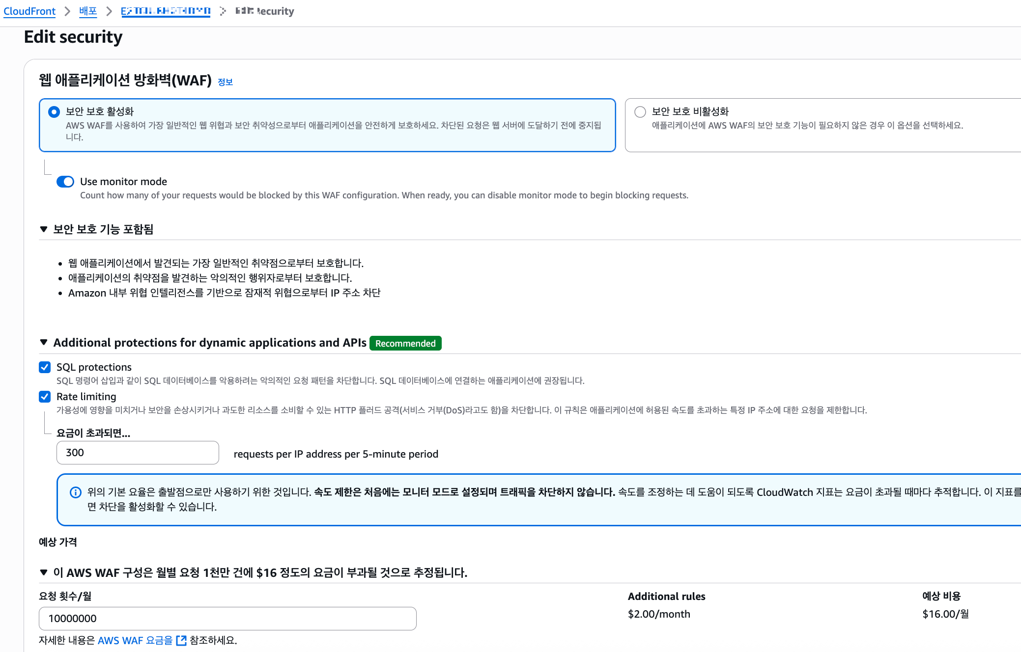 - 보안 설정 ( Edge Location에서 SQL관련 보호와 접속 용량 제한 설정 등 )