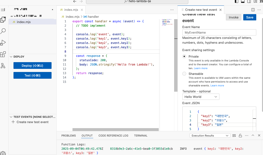 console.log("RECEIVED EVENT:", JSON.stringify(event, null, 2)); #Event,Replacer(필터),Space(들여쓰기 공백)